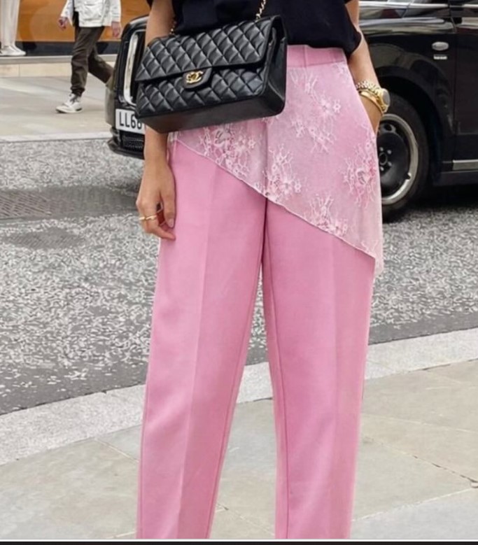 Calça rosa a direito com elástico na cintura, sobreposição de renda na altura da anca