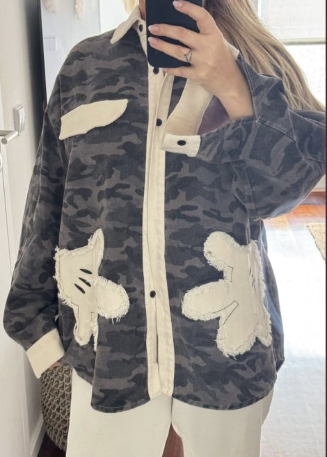 Camisa oversize, padrão army em tom cinza, punhos, colarinho, escapulário e vista frentes em sarja cor cru,